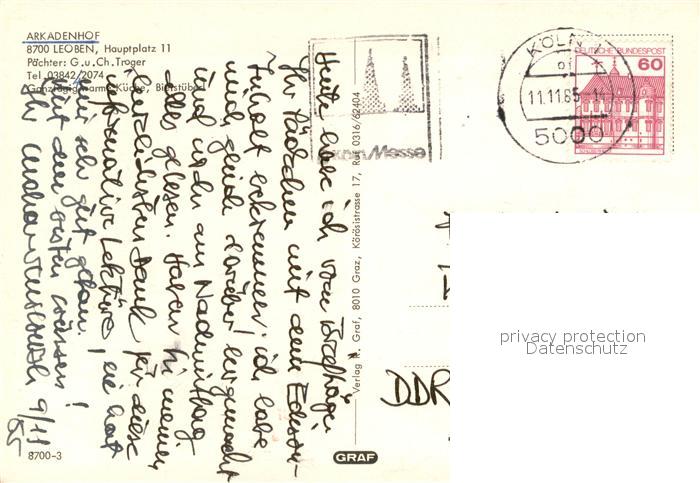 73630321 alte Postkarte Leoben Arkadenhof Restaurant Schwarzer Adler postalisch gelaufen Erhaltung siehe scans [WerneD78] KatCode: 11390223061108