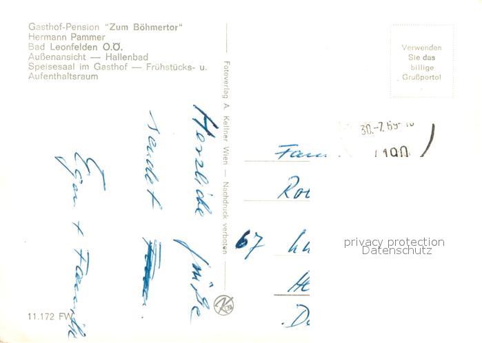 73625208 alte Postkarte Leonfelden Bad Gasthof Pension Zum Boehmertor Hallenbad Speisesaal Fruehstuecksraum postalisch gelaufen Erhaltung siehe scans [FriedD77] KatCode: 11390313041603