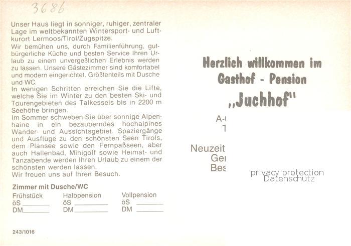 73209465 Lermoos Tirol Gasthof Pension Juchhof Restaurant Fremdenzimmer Wintersport Wettersteingebirge postalisch nicht gelaufen Werbekarte (keine Postkarte) Erhaltung siehe scans [FriedD77] KatCode: 11390331070821