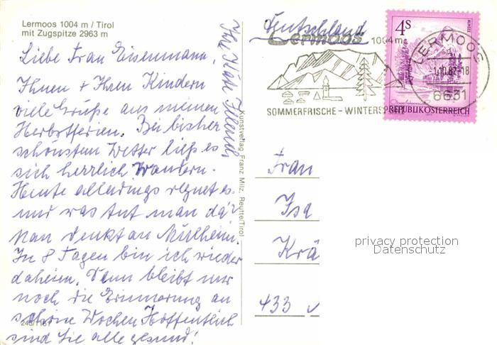 72845105 alte Postkarte Lermoos Tirol Gesamtansicht mit Zugspitze Wettersteingebirge postalisch gelaufen Erhaltung siehe scans [FriedD77] KatCode: 11390331070821