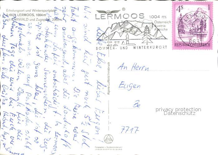 72489841 alte Postkarte Lermoos Tirol mit Ehrwald und Zugspitze Fliegeraufnahme postalisch gelaufen Erhaltung siehe scans KatCode: 11390331070821