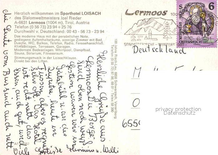 72855340 alte Postkarte Lermoos Tirol Sporthotel Loisach Slalomweltmeistr Josl Rieder postalisch gelaufen Erhaltung siehe scans [WerneD78] KatCode: 11390331070821