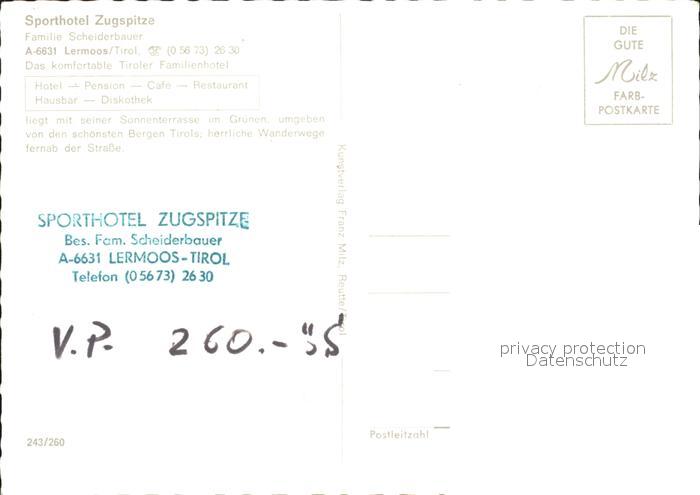 72179935 Lermoos Tirol Sporthotel Zugspitze postalisch nicht gelaufen Erhaltung siehe scans KatCode: 11390331070821