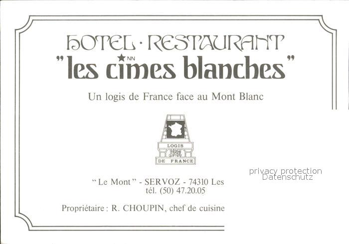 12338282 Les Houches Hotel Restaurant Les Cimes Blanches postalisch nicht gelaufen Werbekarte (keine Postkarte) Erhaltung siehe scans KatCode: 11170074274143