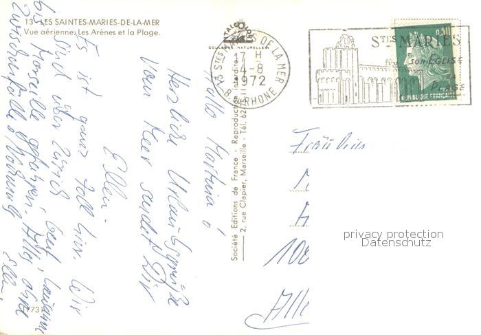13715094 Les Saintes-Maries-de-la-Mer Les arènes et la plage vue aérienne postalisch gelaufen Erhaltung siehe scans [FriedD77] carte postale Frie Katcode 11170013213096