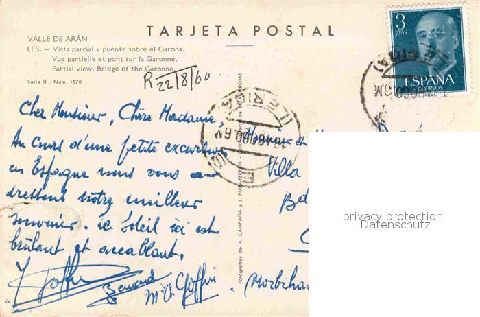 old postcard Les Valle de Aran Vista parcial y puente sobre el Garona postalisch gelaufen Erhaltung siehe scans [WerneD78]