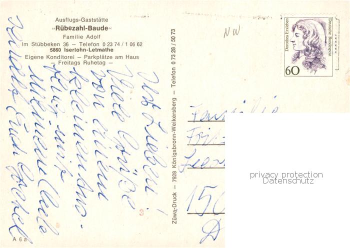 73864489 alte Postkarte Letmathe Oestrich Ausflugs Gaststaette Ruebezahl Baude Gastraeume postalisch gelaufen Erhaltung siehe scans [WerneD78] KatCode: 11110005962024