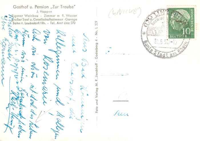 73876705 alte Postkarte Leubsdorf Rhein Gasthof Pension Zur Traube Gastraeume Kirche postalisch gelaufen Erhaltung siehe scans [FriedD77] KatCode: 11110007138037