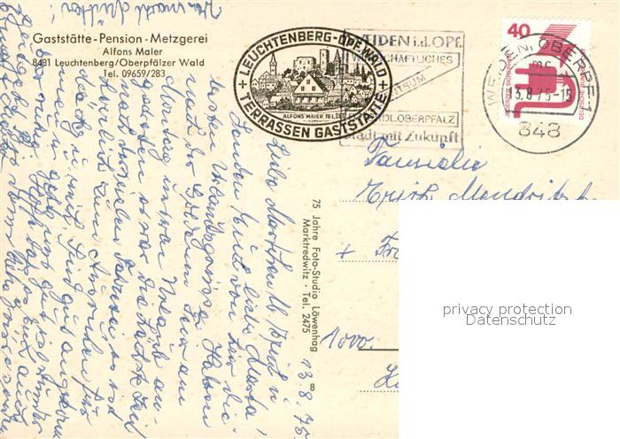 73654675 alte Postkarte Leuchtenberg Gaststaette Pension Maier Restaurant Terrasse Burgruine Naturpark Oberpfaelzer Wald postalisch gelaufen Erhaltung siehe scans [FriedD77] KatCode: 11110009374132