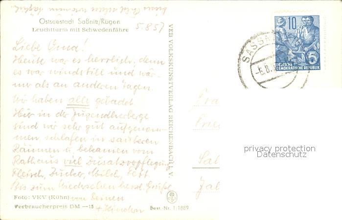 alte Postkarte Leuchtturm Lighthouse Schwedenfaehre Sassnitz Ruegen postalisch gelaufen Erhaltung siehe scans