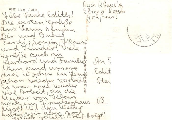 73881349 alte Postkarte Leun Lahn Oberfeldsiedlung Neubaugebiet Lahnbruecke Leuner Fachwerk Alt Leun mit ev Kirche postalisch gelaufen Erhaltung siehe scans [WerneD78] KatCode: 11110006532016