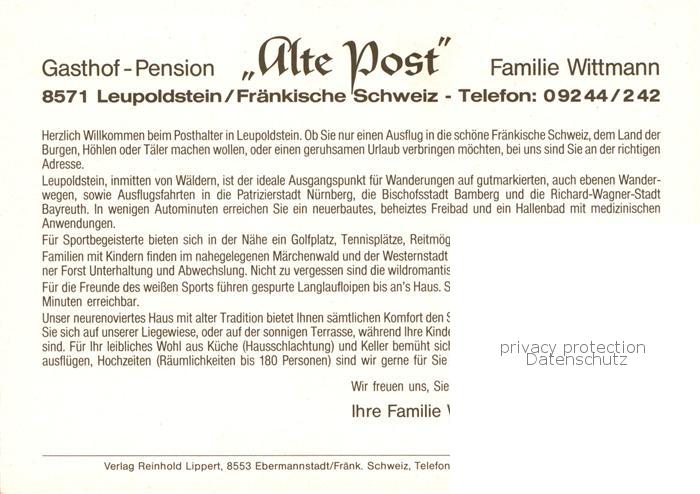 73863044 Leupoldstein Gasthof Pension Alte Post Gastraum postalisch nicht gelaufen Werbekarte (keine Postkarte) Erhaltung siehe scans [FriedD77] KatCode: 11110009472118