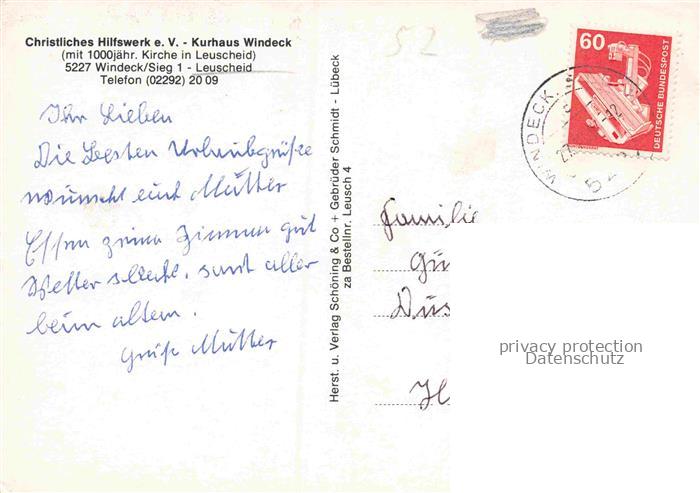 74166625 alte Postkarte Leuscheid Sieg Windeck NRW Kurhaus-Windeck Kirche Klinik Luftbild Wald Leuscheid Doppelturm postalisch gelaufen Erhaltung siehe scans [Karloger] KatCode: 11110005382076