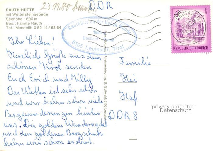 73070804 alte Postkarte Leutasch Rauth Huette mit Wettersteingebirge postalisch gelaufen Erhaltung siehe scans [FriedD77] KatCode: 11390332070326