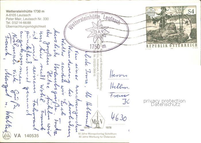 72011495 alte Postkarte Leutasch Wettersteinhuette postalisch gelaufen Erhaltung siehe scans KatCode: 11390332070326