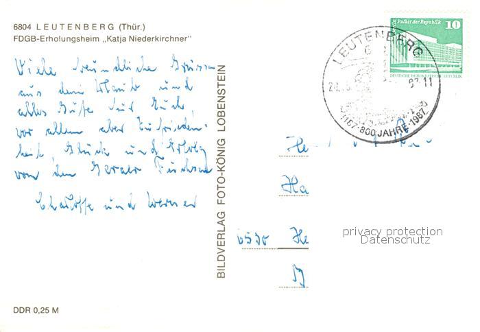 73334680 alte Postkarte Leutenberg Thueringen FDGB Erholungsheim Katja Niederkirchner postalisch gelaufen Erhaltung siehe scans [FriedD77] KatCode: 11110016073106