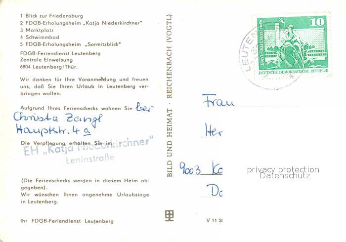 72728498 alte Postkarte Leutenberg Thueringen Friedensburg FDGB Erholungsheime Marktplatz Schwimmbad postalisch gelaufen Erhaltung siehe scans [FriedD77] KatCode: 11110016073106