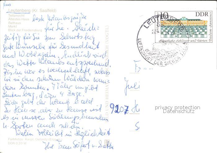 72423643 alte Postkarte Leutenberg Thueringen Panorama aeltestes Haus Rathaus Markt Friedensburg postalisch gelaufen Erhaltung siehe scans KatCode: 11110016073106