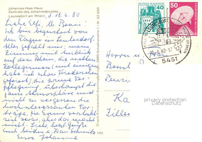72790523 alte Postkarte Leutesdorf Rhein Johannes Haw-Haus postalisch gelaufen Erhaltung siehe scans [LiesaD40] KatCode: 11110007138038