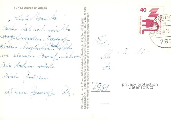 73177340 alte Postkarte Leutkirch Gaenselieselbrunnen Bockturm Pulverturm St Martinskirche Teilansicht Chronik Wappen postalisch gelaufen Erhaltung siehe scans [FriedD77] KatCode: 11110008436055