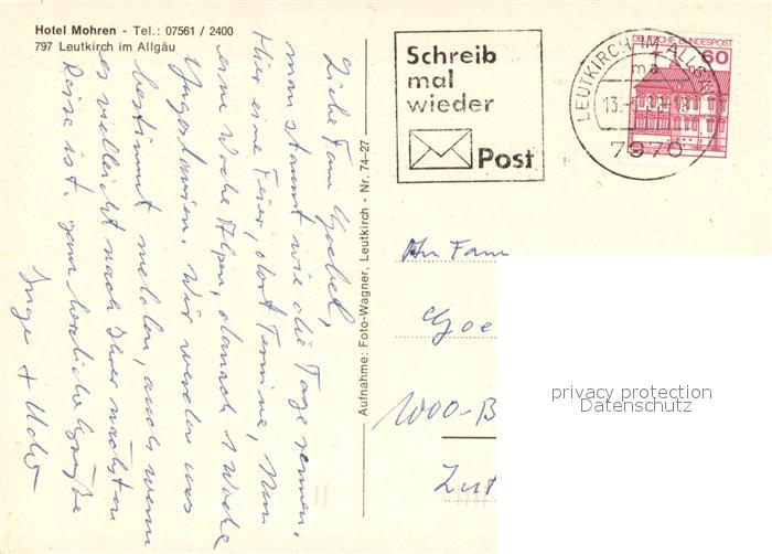 73748025 alte Postkarte Leutkirch Hotel Mohren postalisch gelaufen Erhaltung siehe scans [WerneD78] KatCode: 11110008436055