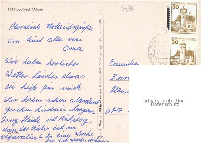 74084439 alte Postkarte Leutkirch Ortspartie postalisch gelaufen Erhaltung siehe scans [WerneD78] KatCode: 11110008436055