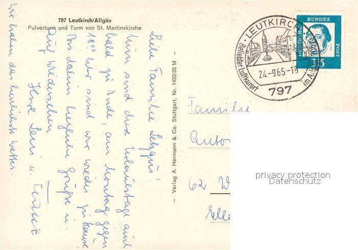 73272858 alte Postkarte Leutkirch Pulverturm und Turm der St Martinskirche postalisch gelaufen Erhaltung siehe scans [WerneD78] KatCode: 11110008436055