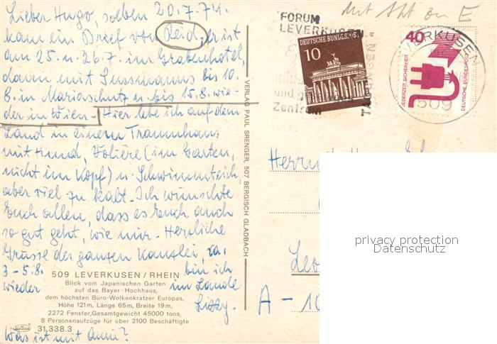 73164353 alte Postkarte Leverkusen Bayer Hochhaus vom Jap Garten gesehen postalisch gelaufen Erhaltung siehe scans [WerneD78] KatCode: 11110005316000