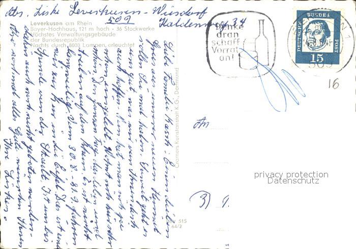 72225540 alte Postkarte LEVERKUSEN CITY Bayer Hochhaus postalisch gelaufen Erhaltung siehe scans KatCode: 11110005316000