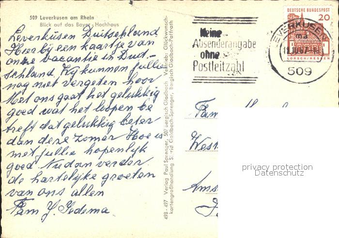 72062354 alte Postkarte LEVERKUSEN CITY Denkmal mit Bayer-Hochhaus postalisch gelaufen Erhaltung siehe scans KatCode: 11110005316000