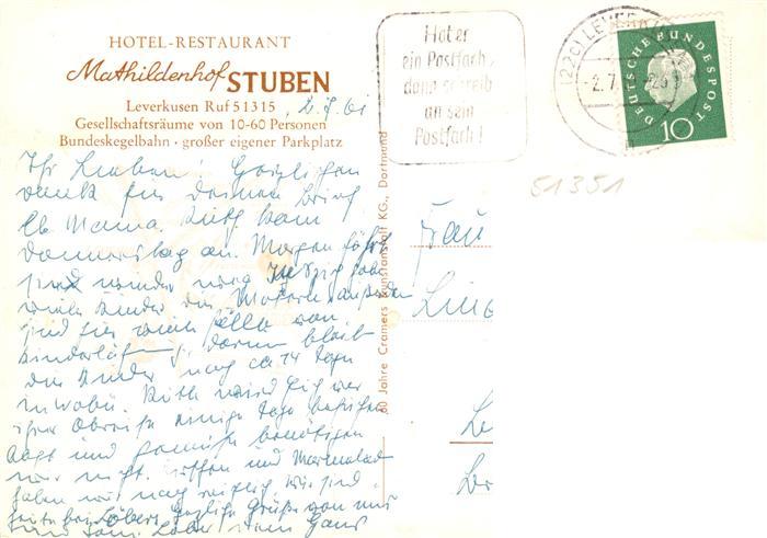 73883542 LEVERKUSEN CITY Hotel Restaurant Mathildenhof Stuben postalisch gelaufen Erhaltung siehe scans [WerneD78] alte Postkarte Wern Katcode 11110005316000