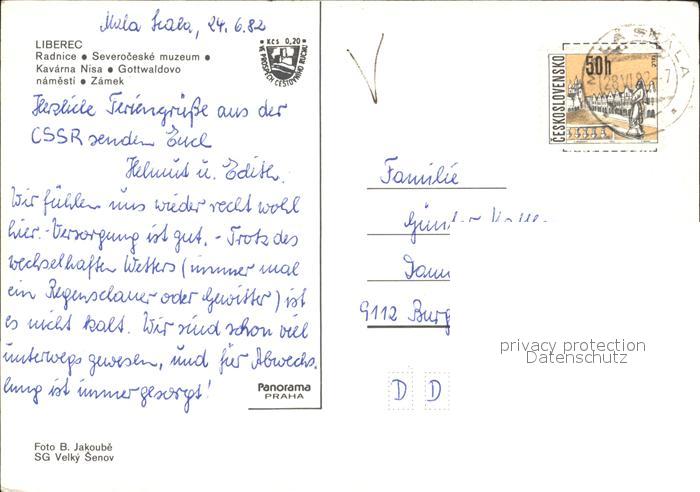 old postcard Liberec Radnice Muzeum Kavarna Nisa Gottwaldovo namesti Zamek Rathaus Museum Platz Schloss postalisch gelaufen Erhaltung siehe scans