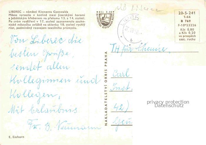 74156420 old postcard LIBEREC Reichenberg CZ Namesti-Klementa-Gottwalda Kaufhaus Strassenbahn Stadtplatz Buerogebaeude Jizerske-Hory Brunnen postalisch gelaufen Erhaltung siehe scans [Karloger] KatCode: 11520