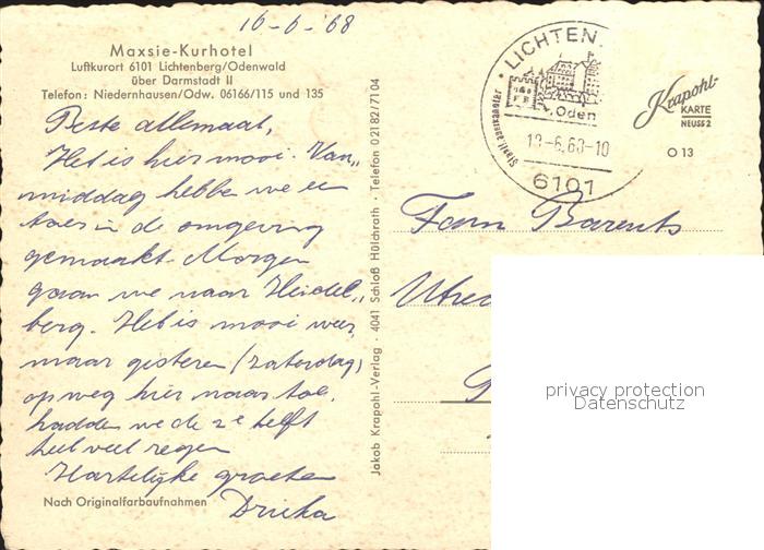 72270687 alte Postkarte Lichtenberg Odenwald Maxsie Kurhotel Luftkurort Schloss Turm postalisch gelaufen Erhaltung siehe scans KatCode: 11110006432007