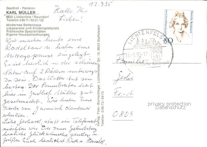 72373524 alte Postkarte Lichtenfels Bayern Reundorf Gasthof Pension Karl Mueller postalisch gelaufen Erhaltung siehe scans KatCode: 11110009478139