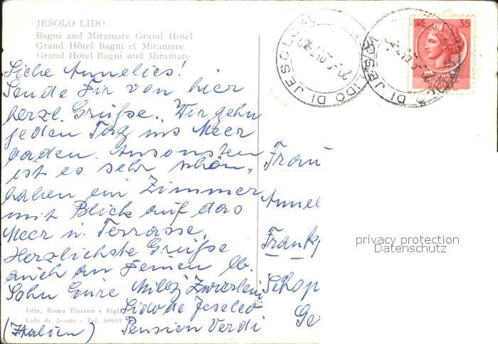 alte Postkarte Lido di Jesolo Grand Hotel Bagni e Miramare postalisch gelaufen Erhaltung siehe scans