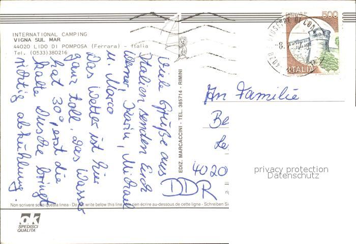 old postcard Lido di Pomposa Camping Vigna sul Mar Spiaggia Strand Sonnenuntergang postalisch gelaufen Erhaltung siehe scans