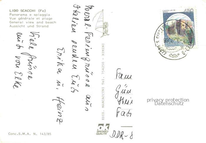 74022789 old postcard Lido Scacchi IT Panorama e spiaggia veduta aerea Kuestenpanorama Strand postalisch gelaufen Fliegeraufnahme Erhaltung siehe scans [FriedD77] KatCode: 11240