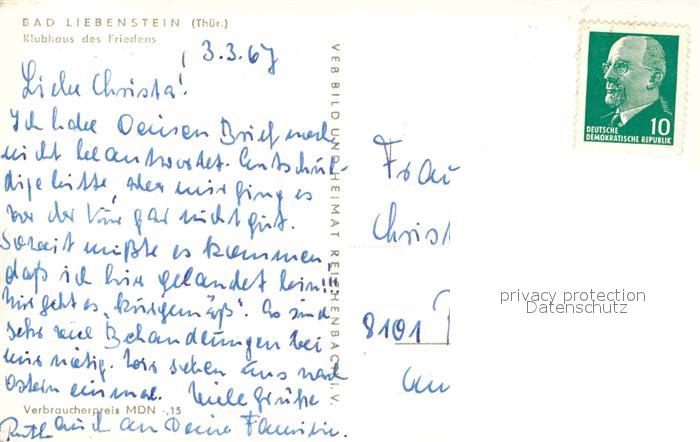 72639826 alte Postkarte Liebenstein Bad Klubhaus Friedens postalisch gelaufen Erhaltung siehe scans [KathaD79] KatCode: 11110016063002