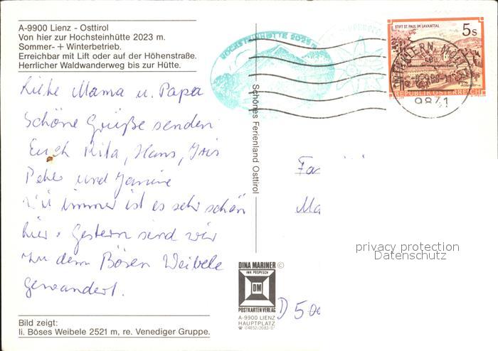 72438219 alte Postkarte Lienz Tirol Hochsteinhuette Venediger Gruppe Boeses Weibel postalisch gelaufen Erhaltung siehe scans KatCode: 11390333070716