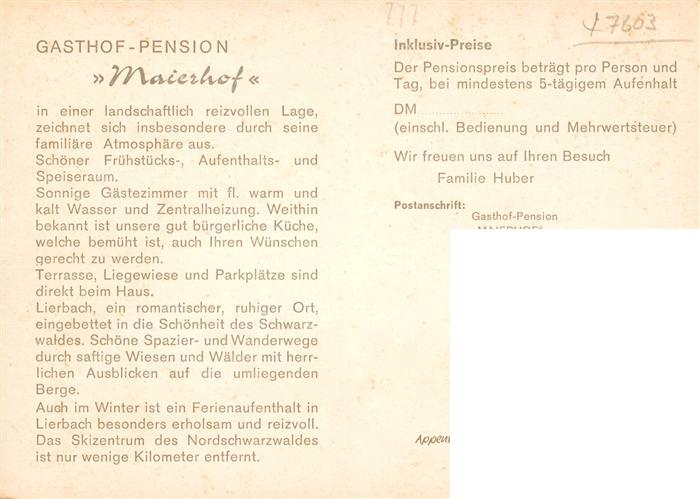 73908630 Lierbach Gasthof Pension Maierhof Gaststube postalisch nicht gelaufen Werbekarte (keine Postkarte) Erhaltung siehe scans [WerneD78] KatCode: 11110008317098