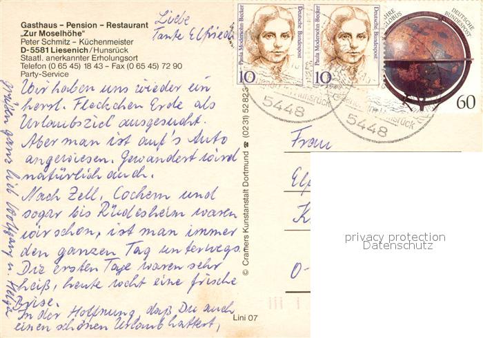 73666774 alte Postkarte Liesenich Gasthaus Pension Zur Moselhoehe Restaurant Kaminzimmer postalisch gelaufen Erhaltung siehe scans [WerneD78] KatCode: 11110007135054