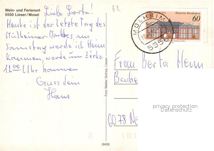 72929508 alte Postkarte Lieser Weinort Moselpartie postalisch gelaufen Erhaltung siehe scans [LiesaD40] KatCode: 11110007231075