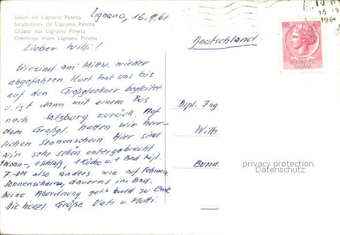 old postcard Lignano Pineta Strand Fontaene Waldweg Strassenpartie postalisch gelaufen Erhaltung siehe scans