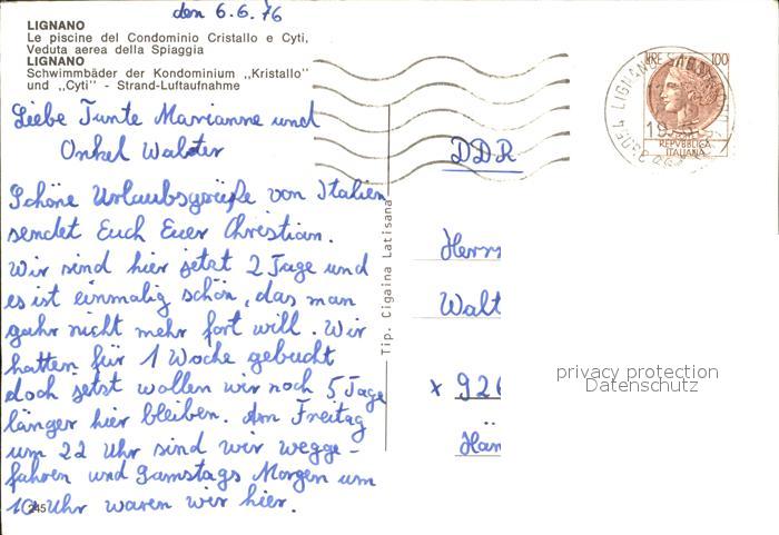 old postcard Lignano Schwimmbaeder der Kondominium Kristallo und Cyti Strand Fliegeraufnahme postalisch gelaufen Erhaltung siehe scans