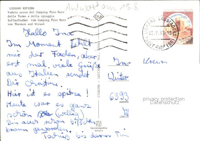 old postcard Lignano Strand Fliegeraufnahme Camping Pino Mare postalisch gelaufen Erhaltung siehe scans
