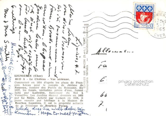 13520753 carte postale Lignieres Cher Chateau vue aérienne postalisch gelaufen Erhaltung siehe scans [FriedD77] KatCode: 11170018218127