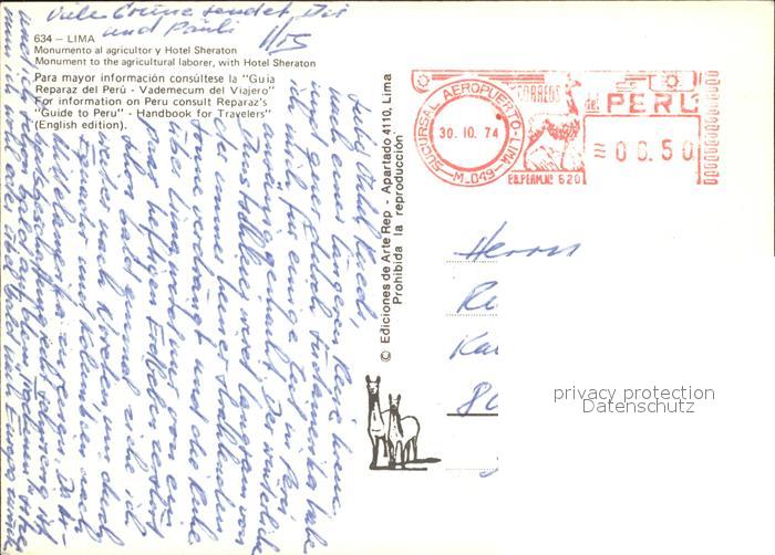 alte Postkarte Lima Peru Hotel Sheraton Denkmal postalisch gelaufen Erhaltung siehe scans