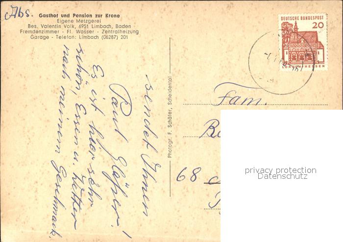 72071555 alte Postkarte Limbach Baden Gasthof Pension zur Krone Muehle Metzgerei Gaststube postalisch gelaufen Erhaltung siehe scans KatCode: 11110008225052