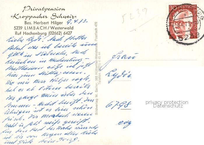 73792982 alte Postkarte Limbach Kroppach Gesamtansicht u. Privatpension Kroppacher Schweiz postalisch gelaufen Erhaltung siehe scans [LiesaD40] KatCode: 11110007143250